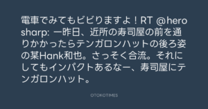 電車でみてもビビりますよ!RT @herosharp: 一昨日、近所の寿司屋の前を通りかかったらテンガロンハットの後ろ姿の某Hank和也。さっそく合流。それにしてもインパクトあるなー、寿司屋にテンガロンハット。