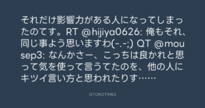 それだけ影響力がある人になってしまったのてす。RT @hijiya0626: 俺もそれ、同じ事よう思いますわ(-.-;) QT @mousep3: なんかさー、こっちは良かれと思って気を使って言うてたのを、他の人にキツイ言い方と思われたりするのはショックやね。なんでその子は本質を