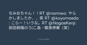 なみおちゃん!!RT @namiwo: やらかしましたか、、笑 RT @koyomaeda: こらー!いうな。RT @NagaeKenji: 前田耕陽のう○こ為…緊急停車(笑)