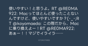 使いやすい!と思うよ。RT @RE0MA922: Macってほとんど使ったことないんですけど、使いやすいですか?(・_・;RT @koyomaeda: この際だから、Macに乗り換えよー!RT @RE0MA922: あぁー!!マジでイライラするうちのPC!!替えたい!!