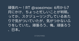 頑張れ〜!RT @soezimax: 6月から7月にかけ、ちょっと忙しいことが判明。ってか、スケジューリングしているあたりで気がついていたが、気がつかないふりをしていた。頑張ろう、俺。頑張ろう、日本。