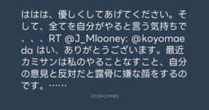 ははは、優しくしてあげてください。そして、全てを自分がやると言う気持ちで、、、RT @J_Mlooney: @koyomaeda はい、ありがとうございます。最近カミサンは私のやることなすこと、自分の意見と反対だと露骨に嫌な顔をするのです。ゆずる様子は全く無し(笑) 女性の強さで