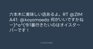 Koyo Maeda @koyomaeda – 12:21・2011年6月9日 2011 6/09 前田耕陽 2011-06-09 六本木に美味しい店あるよ。RT @ZIMA41: @koyomaeda 何がいいですかねー)^o^(今1番行きたいのはオイスターバーです! Source:https://x.com/koyomaeda/status/78663085388345345 text X Post 前田耕陽 前田耕陽 この記事が気に入ったら フォローしてね! Follow @OtokoTimes1988 よかったらシェアしてね! URLをコピーしました! Koyo Maeda @koyomaeda - 12:21・2011年6月9日 Koyo Maeda @koyomaeda - 12:33・2011年6月9日 関連記事 Artist 前田耕陽 1968.08.16