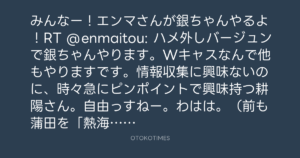 みんなー!エンマさんが銀ちゃんやるよ!RT @enmaitou: ハメ外しバージュンで銀ちゃんやります。Wキャスなんで他もやりますです。情報収集に興味ないのに、時々急にピンポイントで興味持つ耕陽さん。自由っすねー。わはは。(前も蒲田を「熱海熱海」と連呼) @koyomaeda: