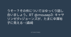 うそー?その件についてはゆっくり話し合いましょう。RT @mousep3: キャサリンゼタ=ジョーンズが、たまに中澤裕子に見える…▷森崎