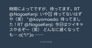時間によってですが、待ってます。RT @NagaeKenji: いや‼ 待ってないはずや(笑) “@koyomaeda: 待ってました!RT @NagaeKenji: 今日はツイキャスやるぞ~(笑) どんなに遅くなっても… o(^▽^)o 時間は追ってツイートします。