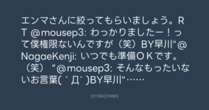 エンマさんに絞ってもらいましょう。RT @mousep3: わっかりましたー!って僕権限ないんですが(笑)BY早川“@NagaeKenji: いつでも準備OKです。(笑) “@mousep3: そんなもったいないお言葉(´Д` )BY早川“@NagaeKenji: 僕はいつ呼ん