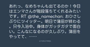 あれっ、なめちゃんも出てるのか!今日はエンマさんが階段落ちてくれるみたいです。RT @the_namechan: おひさしぶりにツイッター。明日で蒲田が終わる。只今入浴中。身体がガッタガタで面白い。こんなになるのが久しぶり。蒲田をやってて、何だか芝居の原点に触れれてる気がする。