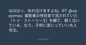 Koyo Maeda @koyomaeda – 12:09・2011年6月20日 2011 6/20 前田耕陽 2011-06-20 はははっ、あれ泣けますよね。RT @soezimax: 歯医者の待合室で流されていた「トイ・ストーリー3」を観て、軽く泣いている、なう。子供に混じっていい大人号泣。 Source:https://x.com/koyomaeda/status/82646286569971712 text X Post 前田耕陽 前田耕陽 この記事が気に入ったら フォローしてね! Follow @OtokoTimes1988 よかったらシェアしてね! URLをコピーしました! Koyo Maeda @koyomaeda - 12:07・2011年6月20日 Koyo Maeda @koyomaeda - 12:10・2011年6月20日 関連記事 Artist 前田耕陽 1968.08.16