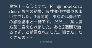 良性!一安心ですね。RT @inouekozodesu: 診断の結果、良性発作性頭位めまい症でした。3週間前、東京の耳鼻科での診断結果と一緒です。だだし、薬は漢方薬に変えられました。あと2週間で治るはず、と断言されました。皆さん、たくさんの情報、ありがとうございました!