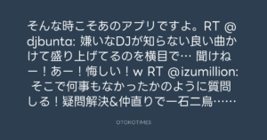そんな時こそあのアプリですよ。RT @djbunta: 嫌いなDJが知らない良い曲かけて盛り上げてるのを横目で… 聞けねー!あー!悔しい!w RT @izumillion: そこで何事もなかったかのように質問しる!疑問解決&仲直りで一石二鳥。てか知りたい疑問を解決するのが最優先だ