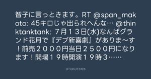 智子に言っときます。RT @span_makoto: 45キロじゃ出られへんな… @thinktanktank: 7月13日(水)なんばグランド花月で『デブ新喜劇』がありま〜す!前売2000円当日2500円になります!開場19時開演19時30分です!お問い合わせはチケットよしもと