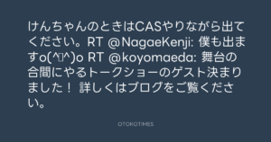 Koyo Maeda @koyomaeda – 17:13・2011年7月9日 2011 7/09 前田耕陽 2011-07-09 けんちゃんのときはCASやりながら出てください。RT @NagaeKenji: 僕も出ますo(^▽^)o RT @koyomaeda: 舞台の合間にやるトークショーのゲスト決まりました! 詳しくはブログをご覧ください。 Source:https://x.com/koyomaeda/status/89608133592350720 text X Post 前田耕陽 前田耕陽 この記事が気に入ったら フォローしてね! Follow @OtokoTimes1988 よかったらシェアしてね! URLをコピーしました! Koyo Maeda @koyomaeda - 16:30・2011年7月9日 寺岡呼人 @yohito_teraoka - 18:14・2011年7月9日 関連記事 Artist 前田耕陽 1968.08.16
