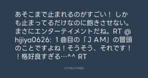 しかも止まってるだけなのに飽きさせない。まさにエンターテイメントだね。RT @hijiya0626: 1曲目の「JAM」の冒頭のことですよね!そうそう、それです!!格好良すぎる…^^ RT