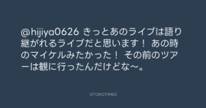 Koyo Maeda @koyomaeda – 0:17・2011年7月12日 2011 7/12 前田耕陽 2011-07-12 @hijiya0626 きっとあのライブは語り継がれるライブだと思います! あの時のマイケルみたかった! その前のツアーは観に行ったんだけどな〜。 Source:https://x.com/koyomaeda/status/90439627642650625 text X Post 前田耕陽 前田耕陽 この記事が気に入ったら フォローしてね! Follow @OtokoTimes1988 よかったらシェアしてね! URLをコピーしました! Koyo Maeda @koyomaeda - 0:12・2011年7月12日 寺岡呼人 @yohito_teraoka - 2:52・2011年7月12日 関連記事 Artist 前田耕陽 1968.08.16