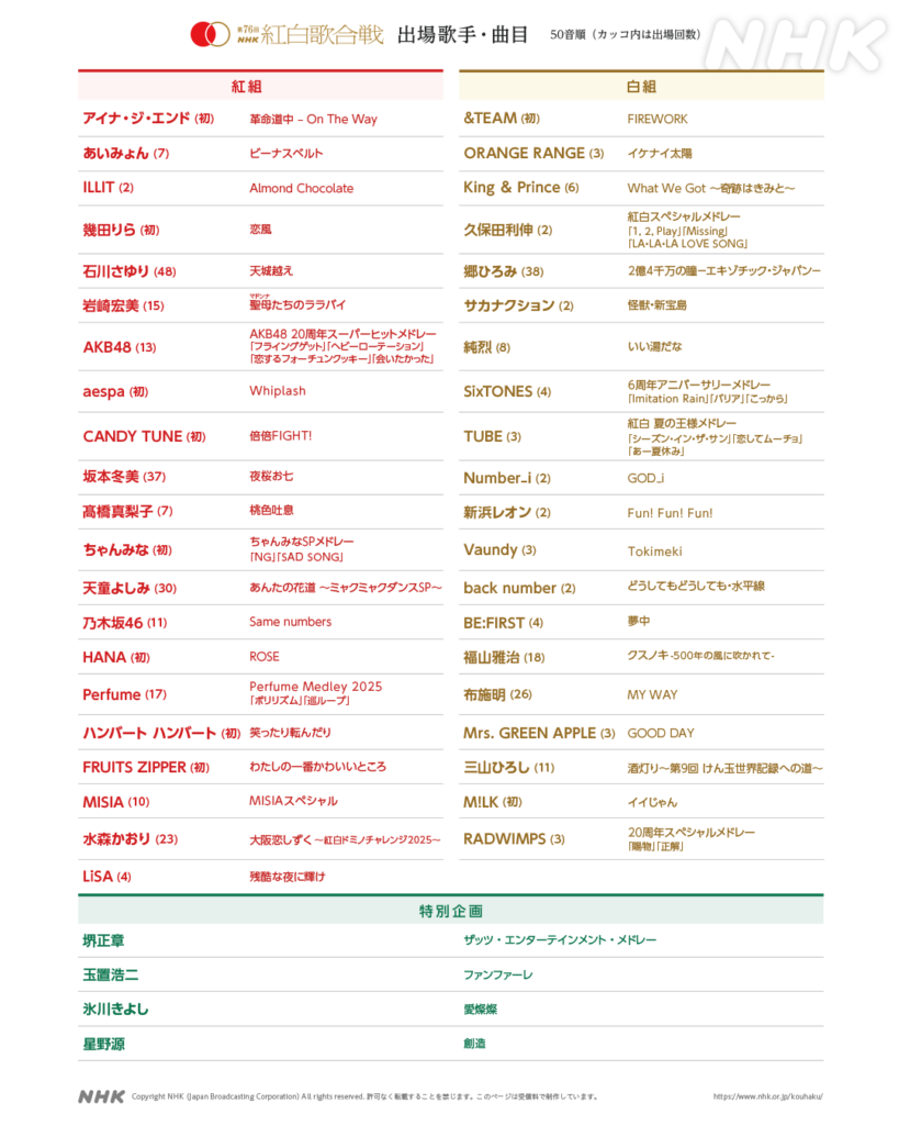 🔴第76回 #NHK紅白 ⚪️ 曲目が決定しました🎉✨ https://www.nhk.or.jp/kouhaku/to... -