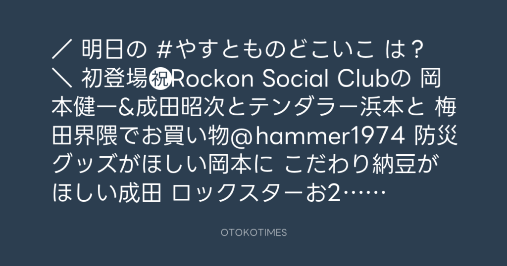 / 明日の #やすとものどこいこ は? \ 初登場㊗️Rockon Social Clubの 岡本健一&... -