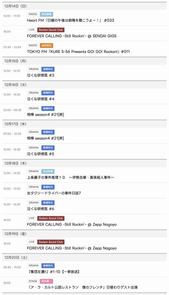 12/14〜12/20までのスケジュールをお届けします。 ※現時点で確認可能な範囲のみ。 ... -