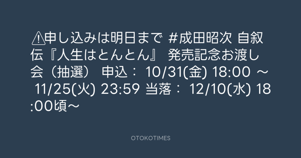 ⚠️申し込みは明日まで #成田昭次 自叙伝『人生はとんとん』 発売記念お渡し会(抽... -