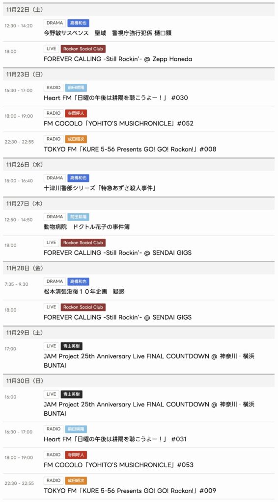 11/22〜11/30までのスケジュールをお届けします。 ※現時点で確認可能な範囲のみ。 ... -