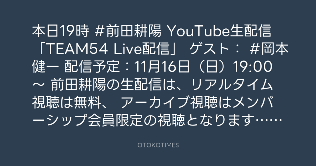 🎥本日19時 #前田耕陽 YouTube生配信「TEAM54 Live配信」 ゲスト: #岡本健一 📅 ... -
