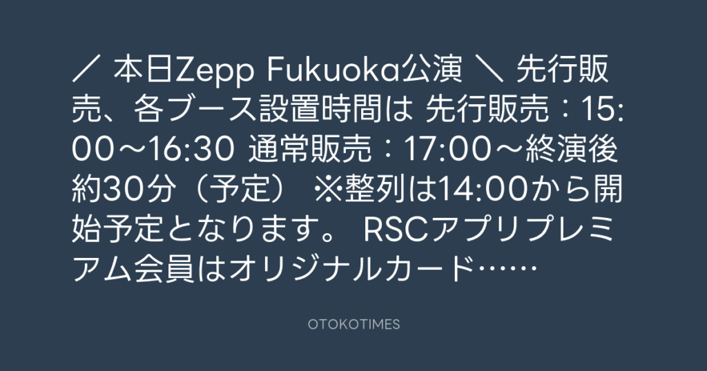 / 本日Zepp Fukuoka公演🎸 \ 先行販売、各ブース設置時間は👇 先行販売:15:00〜...