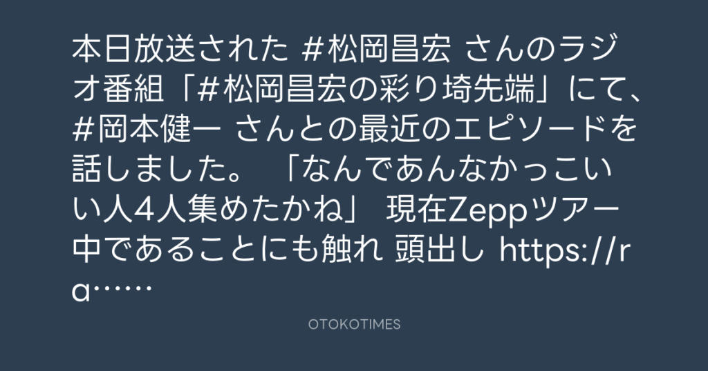 本日放送された #松岡昌宏 さんのラジオ番組「#松岡昌宏の彩り埼先端」にて、#岡本... -