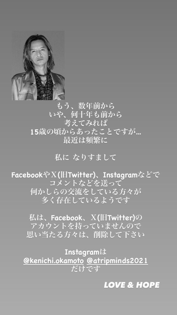 #岡本健一 本人インスタからのなりすまし注意喚起 ”もう、数年前から いや、何十年... -