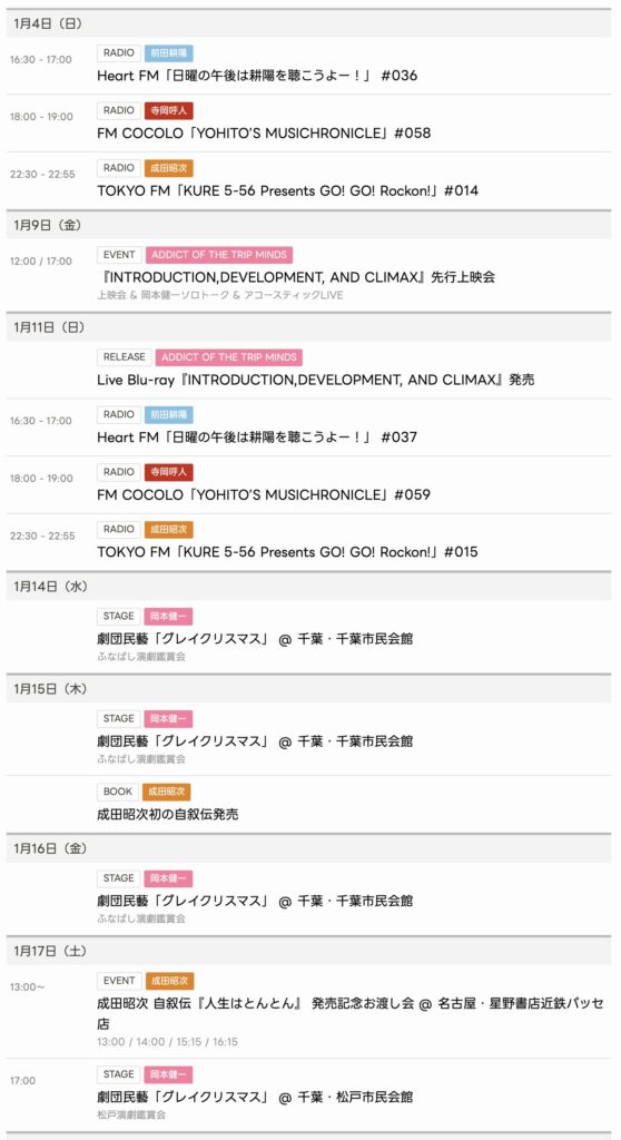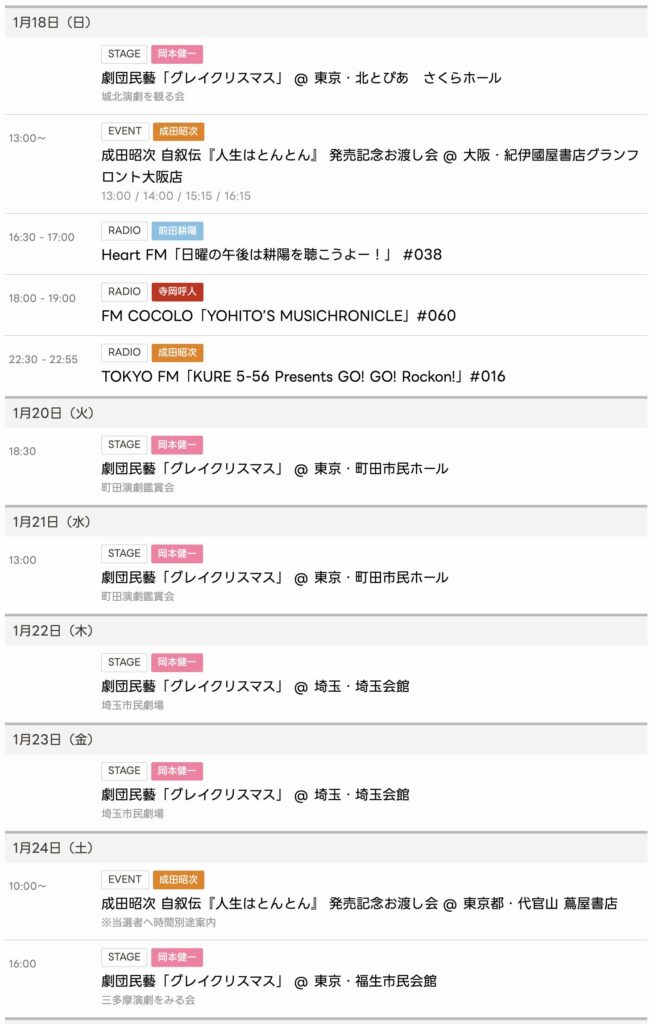 2026/1/4〜1/17までのスケジュールをお届けします。 ※現時点で確認可能な範囲のみ... -