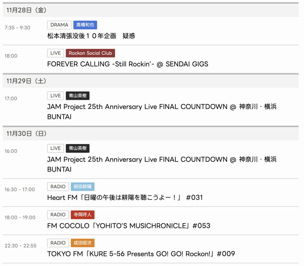 11/21〜11/27までのスケジュールをお届けします。 ※現時点で確認可能な範囲のみ。 ... -