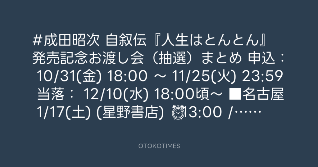 #成田昭次 自叙伝『人生はとんとん』 発売記念お渡し会(抽選)まとめ 申込: 10/3... -