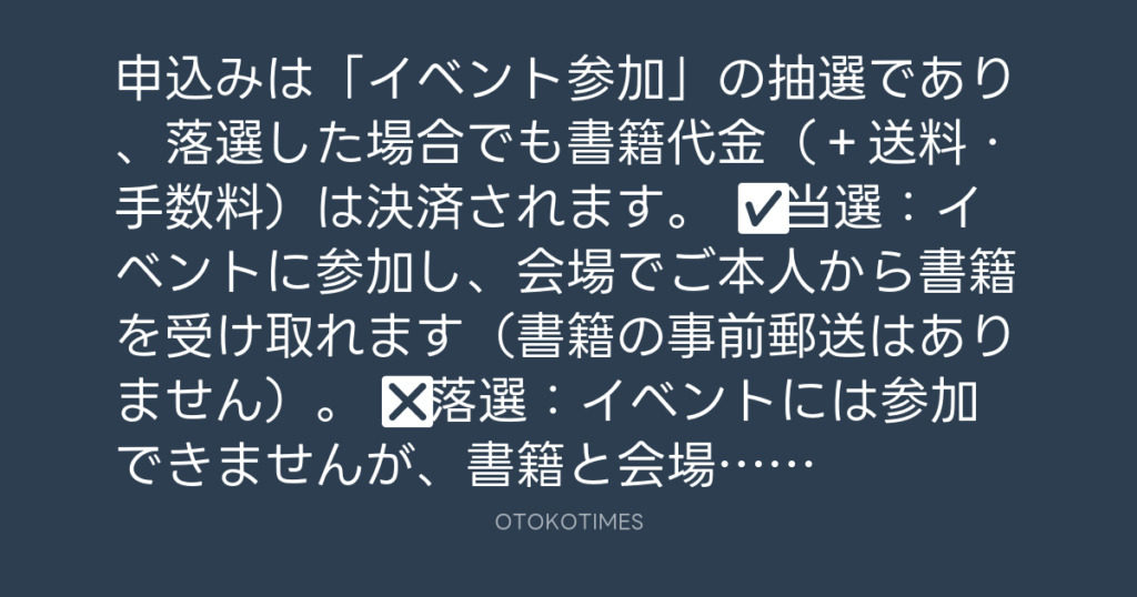 🈸申込みは「イベント参加」の抽選であり、落選した場合でも書籍代金(+送料・手... -