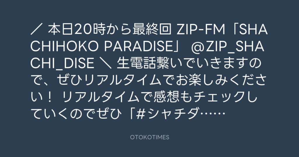 / 本日20時から最終回 ZIP-FM「SHACHIHOKO PARADISE」 @ZIP_SHACHI_DISE \ 生電... -