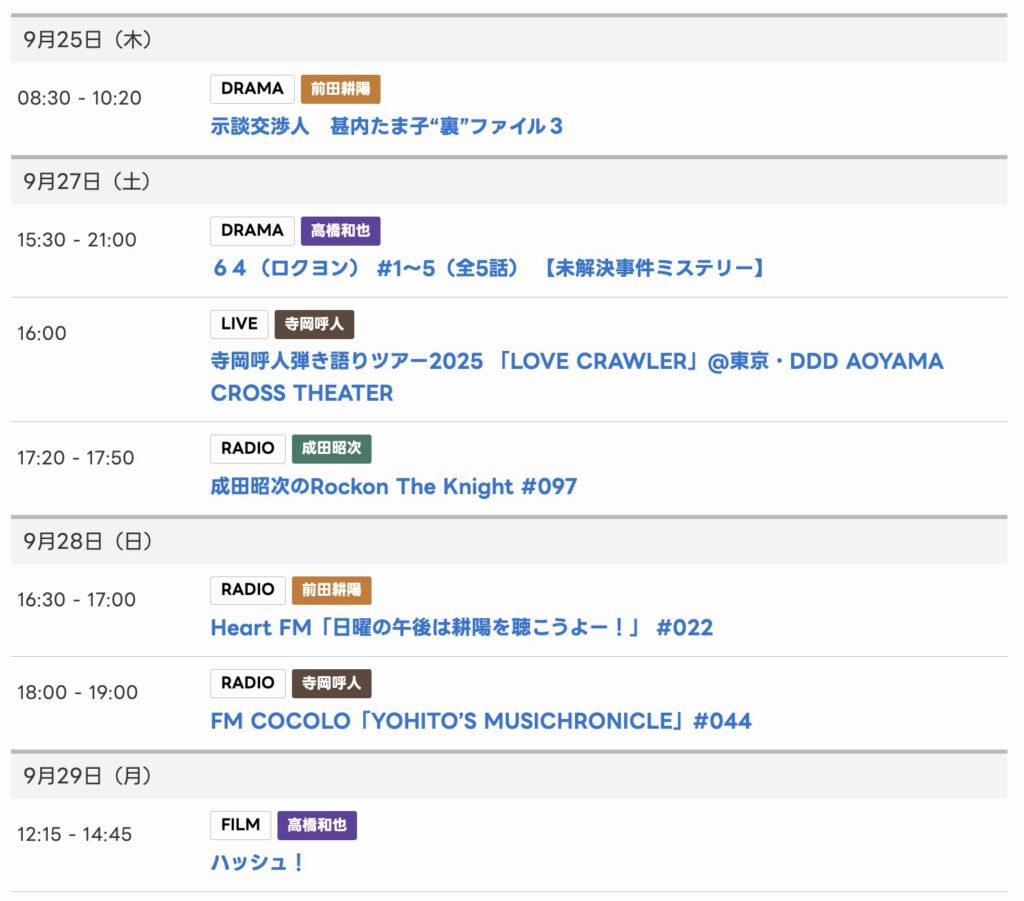 9/25〜9/29までのスケジュールをお届けします。 ※現時点で確認可能な範囲のみ。 (... -
