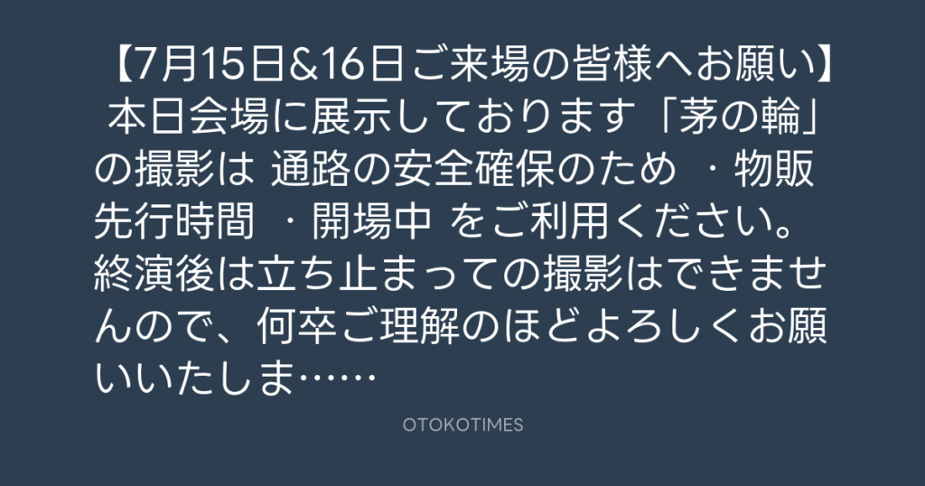 【7月15日&16日ご来場の皆様へお願い】 本日会場に展示しております「茅の輪」... -