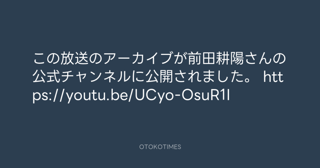 この放送のアーカイブが前田耕陽さんの公式チャンネルに公開されました。 https://... -