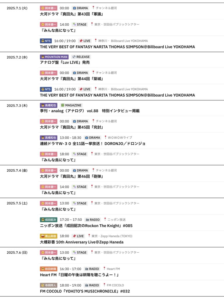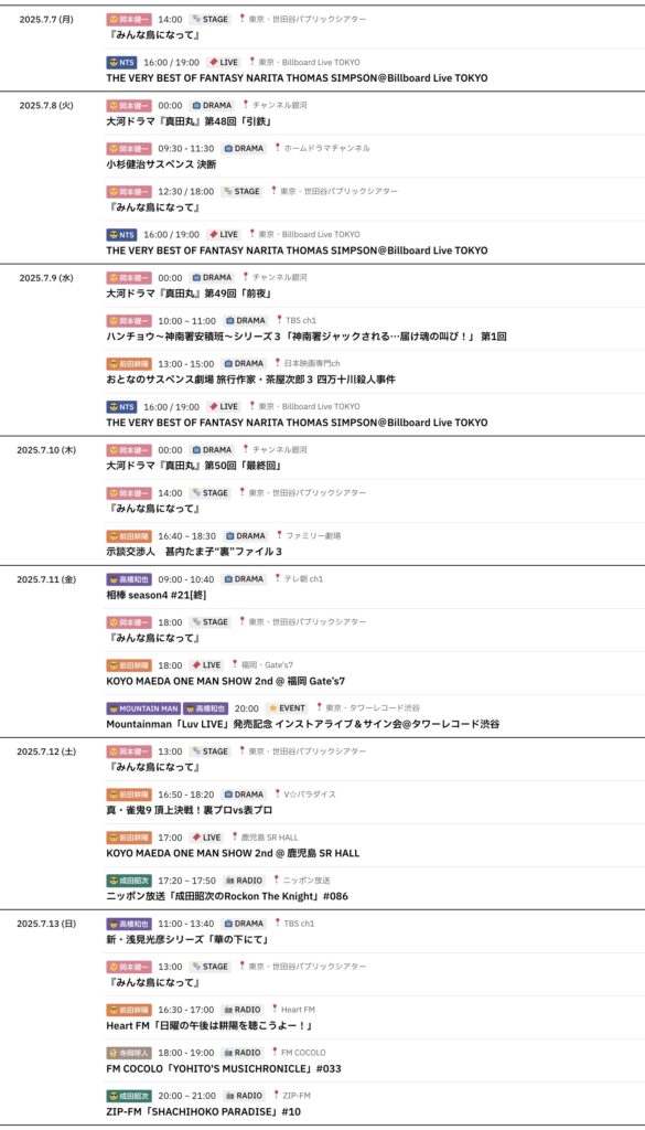 7/7~7/13までのスケジュールをお届けします。 ※現時点で確認可能な範囲のみ。 (20... -