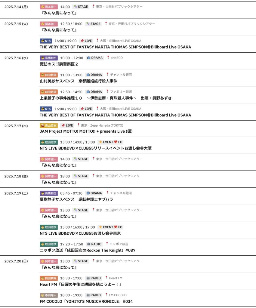 7/14~7/20までのスケジュールをお届けします。 ※現時点で確認可能な範囲のみ。 (2... -