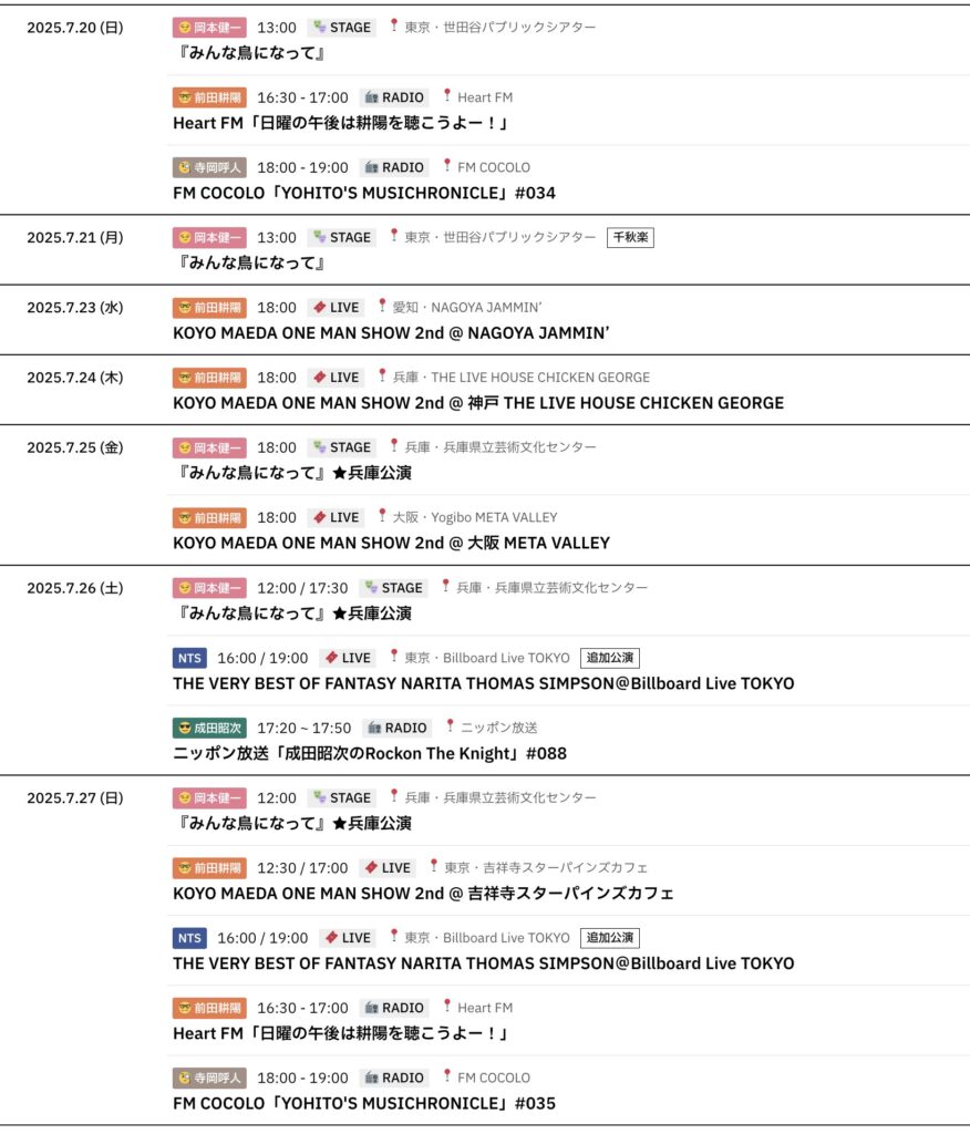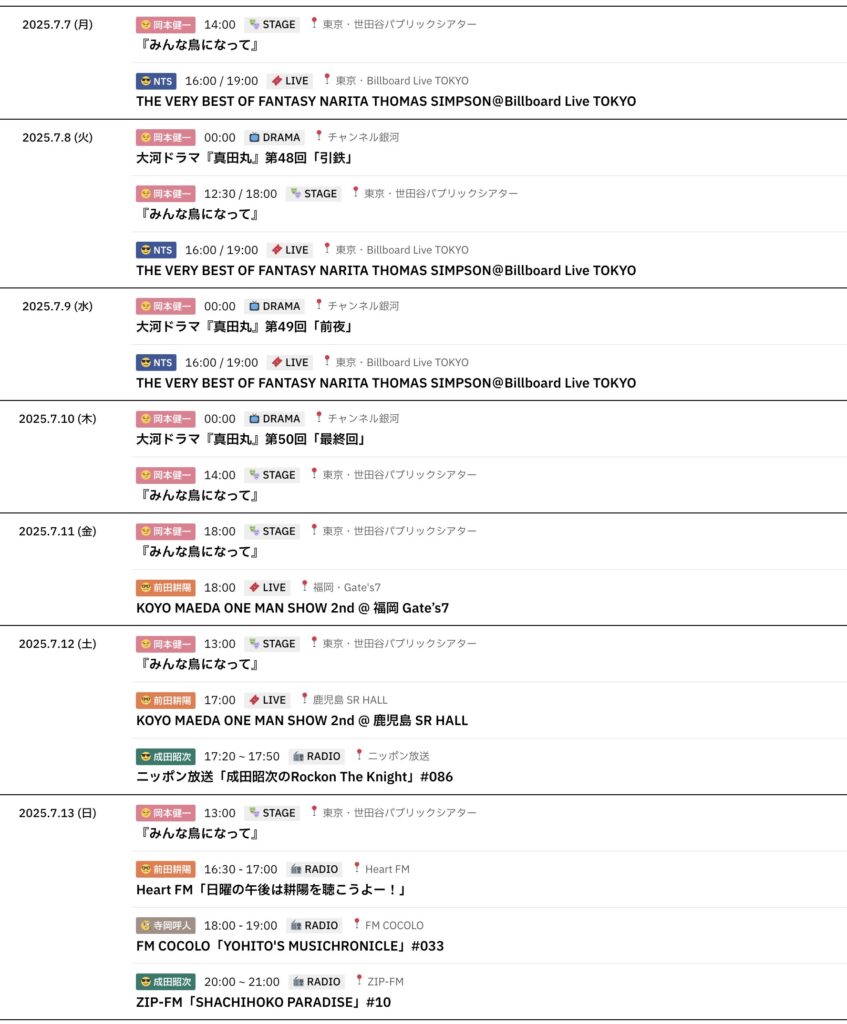 7/7~7/13までのスケジュールをお届けします。 ※現時点で確認可能な範囲のみ。 (20... -