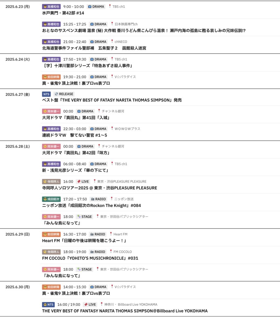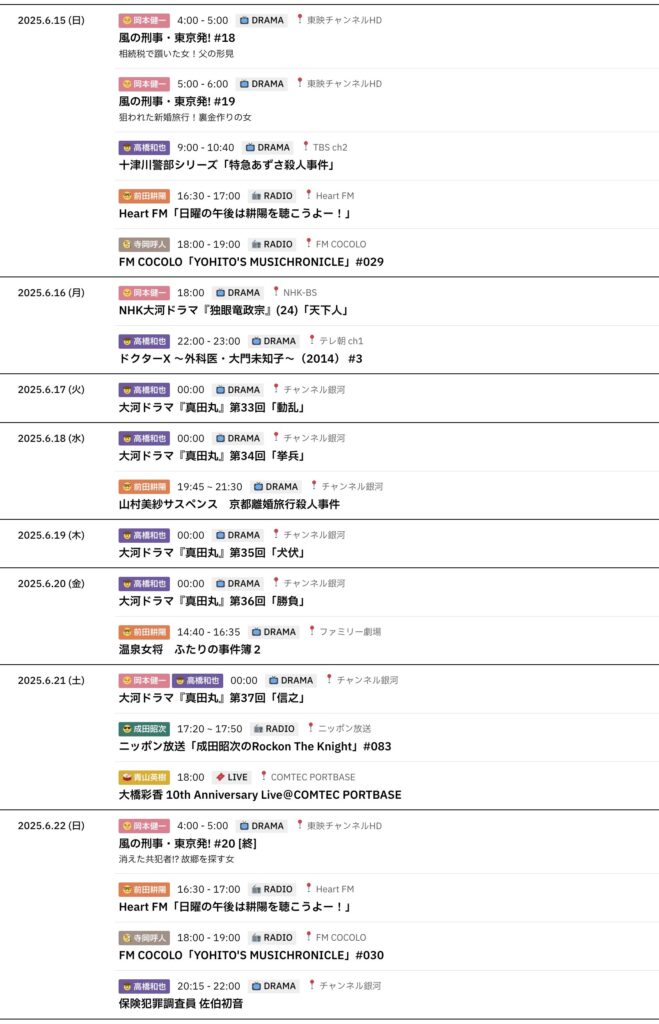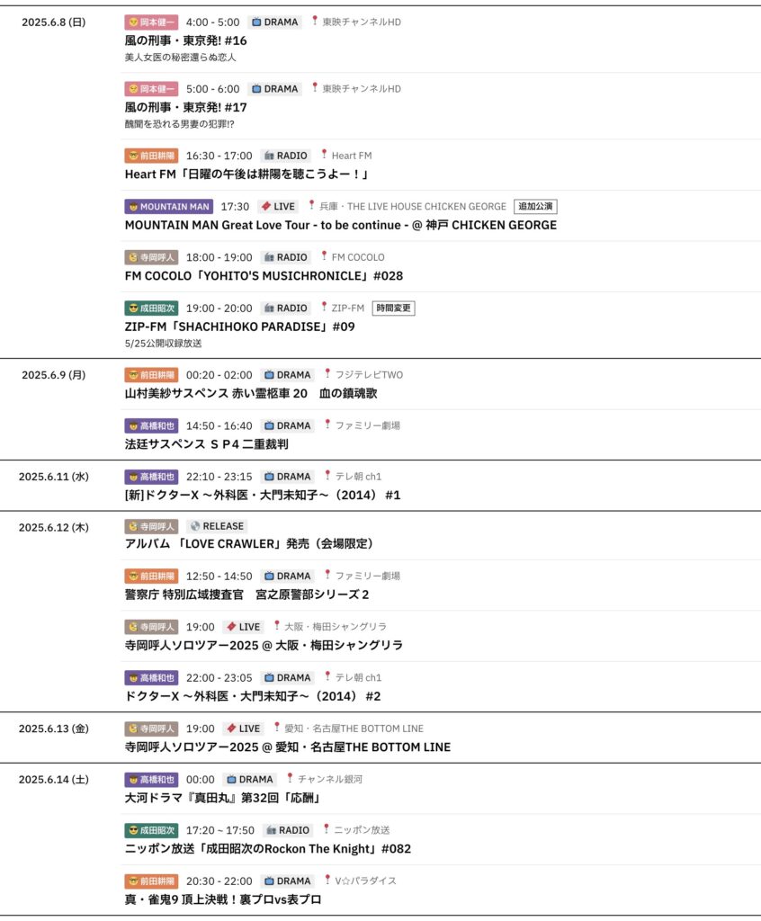 6/8~6/14までのスケジュールをお届けします。 ※現時点で確認可能な範囲のみ。 (20... -