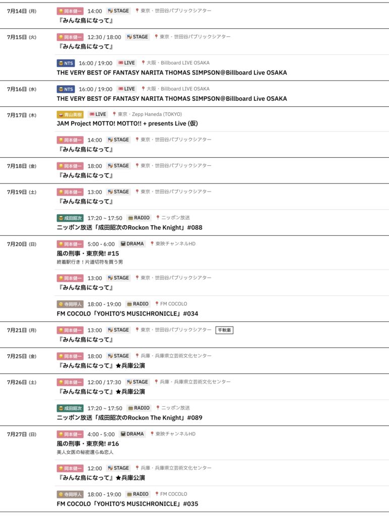 📅 7/14〜7/27までのスケジュールをお届けします。 ※現時点で確認可能な範囲のみ。... -