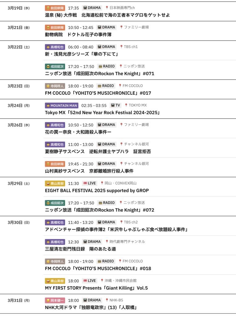 📅 3/19〜3/31までのスケジュールをお届けします。 ※現時点で確認可能な範囲のみ。... -