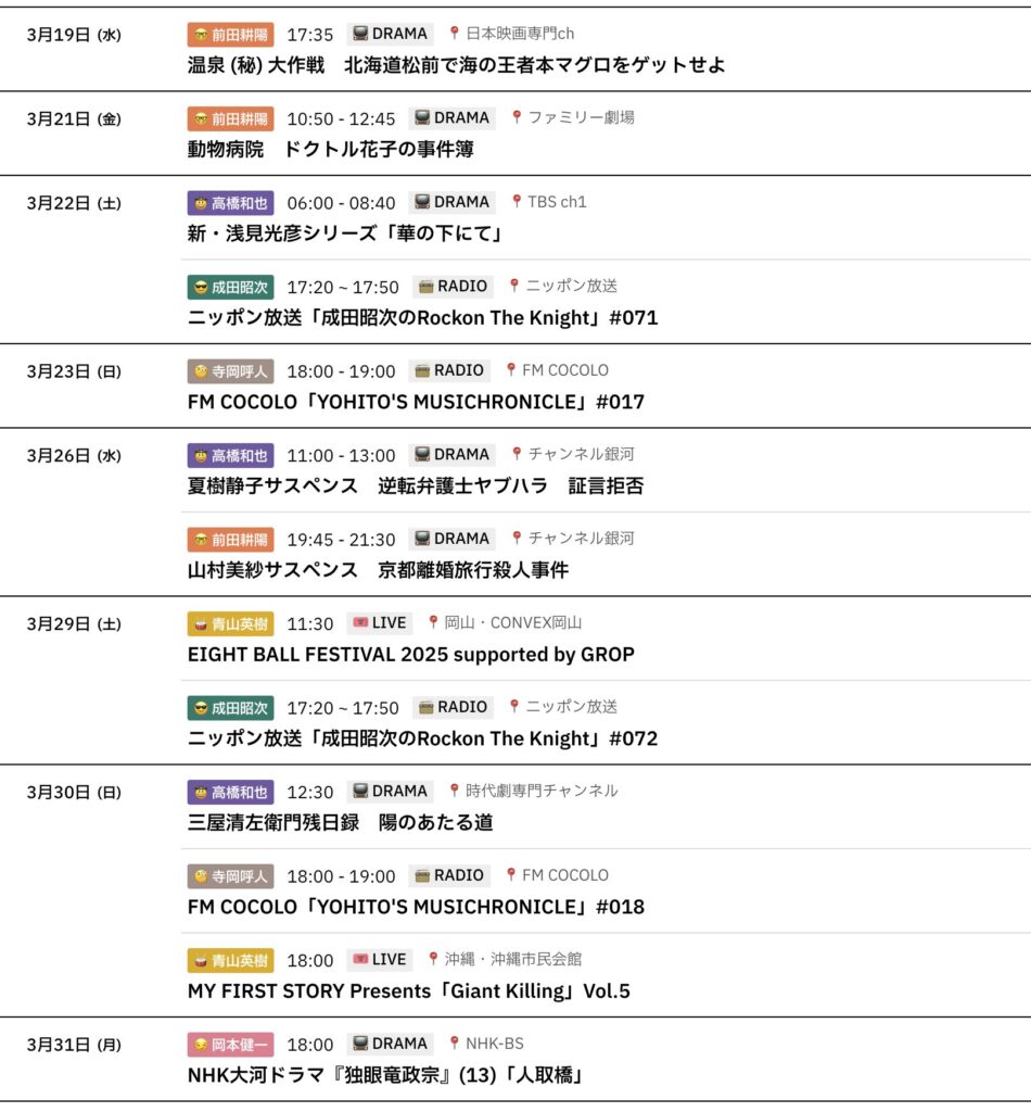 📅 3/19〜3/31までのスケジュールをお届けします。 ※現時点で確認可能な範囲のみ。...