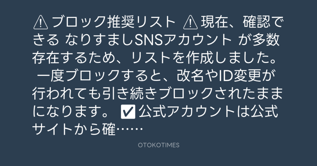 ⚠️ ブロック推奨リスト ⚠️ 現在、確認できる なりすましSNSアカウント が多数存在... -