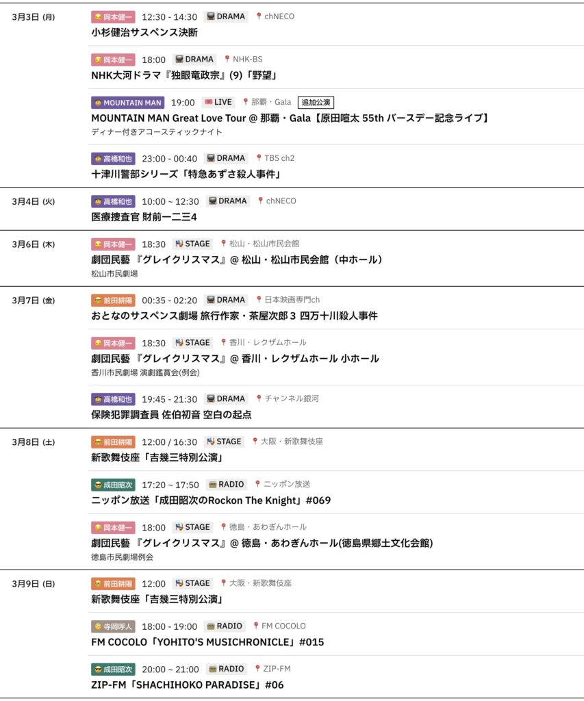 📅 3/3〜3/9までのスケジュールをお届けします。 ※現時点で確認可能な範囲のみ。 ... -