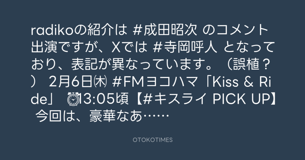 radikoの紹介は #成田昭次 のコメント出演ですが、Xでは #寺岡呼人 となっており、... -