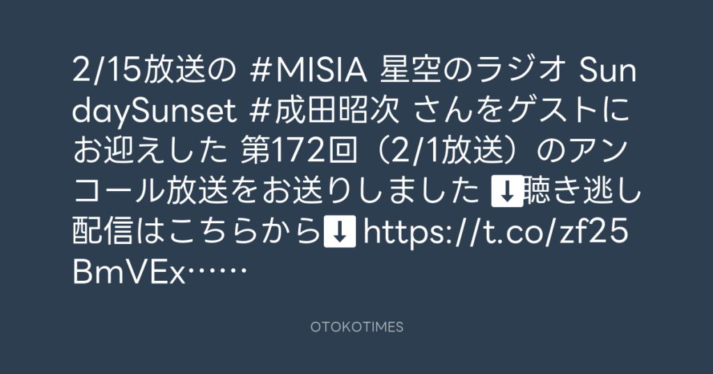 2/15放送の #MISIA 星空のラジオ SundaySunset #成田昭次 さんをゲストにお迎えし... -