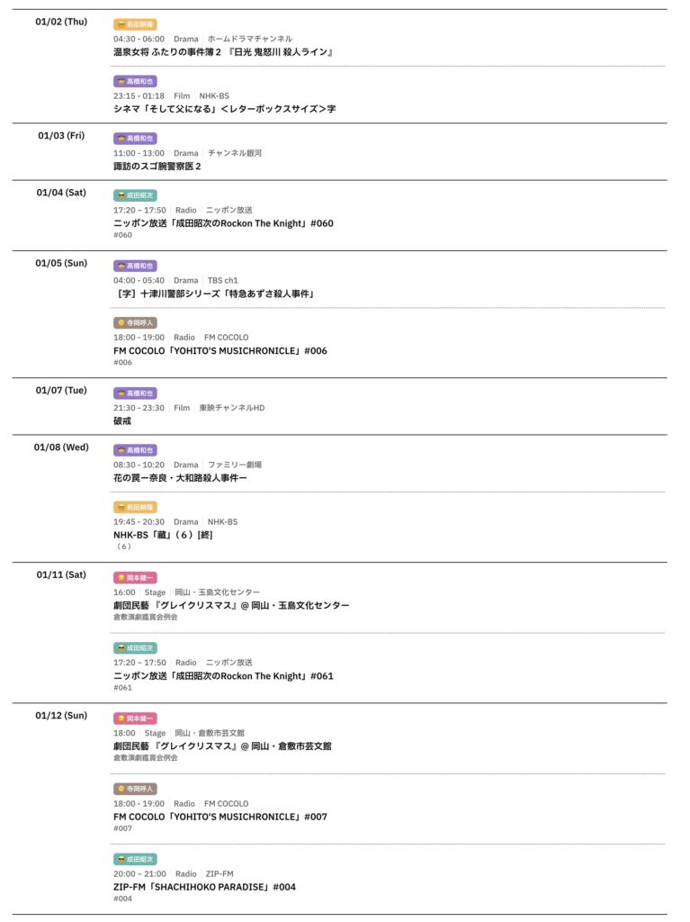 📅 2025/1/12までのスケジュールをお届けします。 (現時点で確認可能な範囲のみ) -