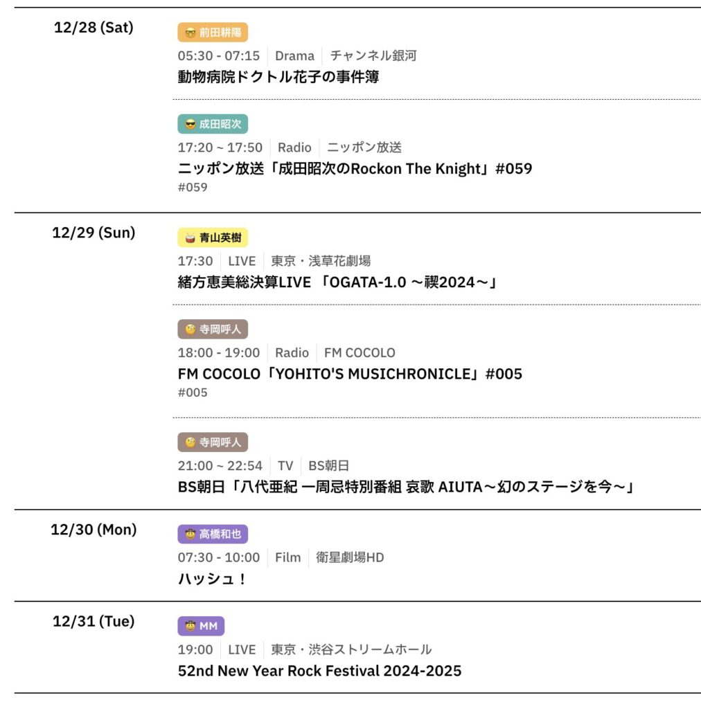 📅 2024/12/31までのスケジュールをお届けします。 (現時点で確認可能な範囲のみ) -