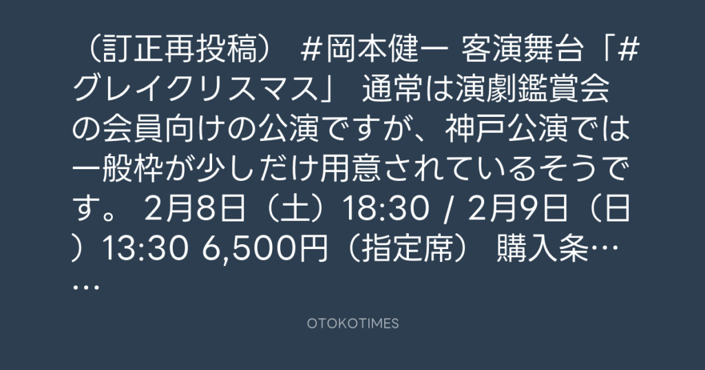 (訂正再投稿) #岡本健一 客演舞台「#グレイクリスマス」 通常は演劇鑑賞会の会員... -